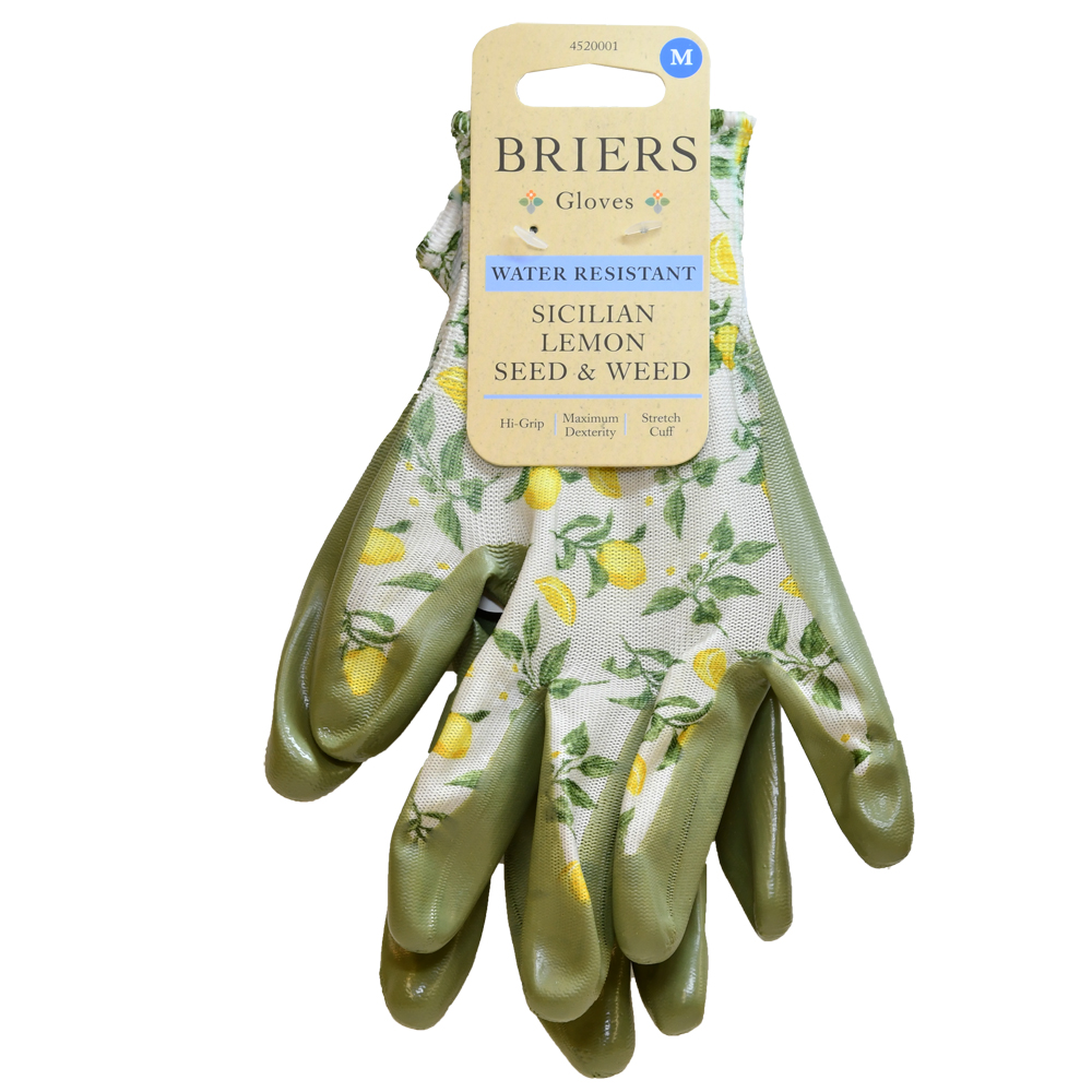 Waterbestendige en watervaste soepel dragende dameshandschoenen met palmbescherming. Met vrolijk citroen design. Geschikt voor onkruid wieden of het verpotten en stekken van plantjes.