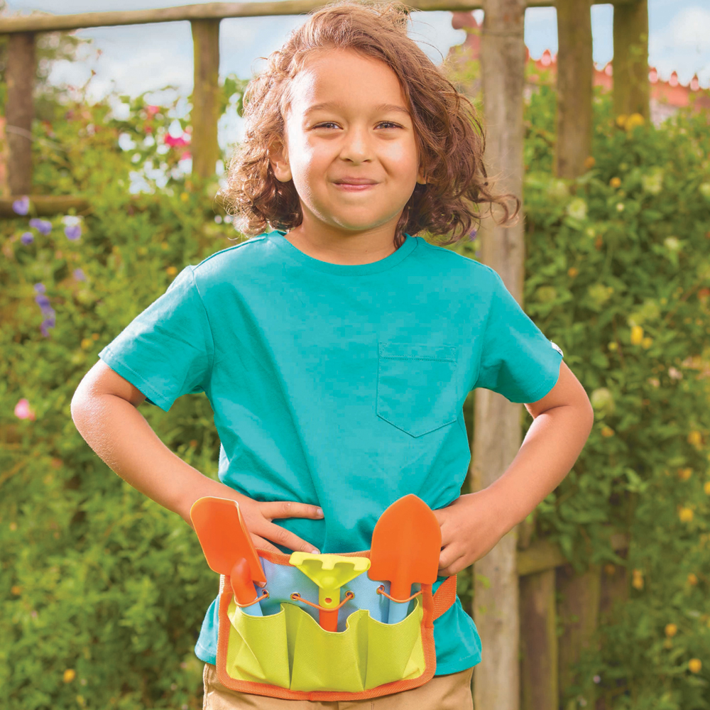 Kleurrijk en praktische kinder riem met 3 stuks metalen gereedschap. Een schepje, harkje en vork.. Perfect voor de kleine klussers.
