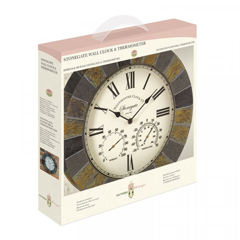 Klok met brede lei kleurige steenlook rand. Met romeinse cijfers en hygro- en thermometer. Heeft 1 AA batterij nodig om te werken. 2 jaar garantie.
