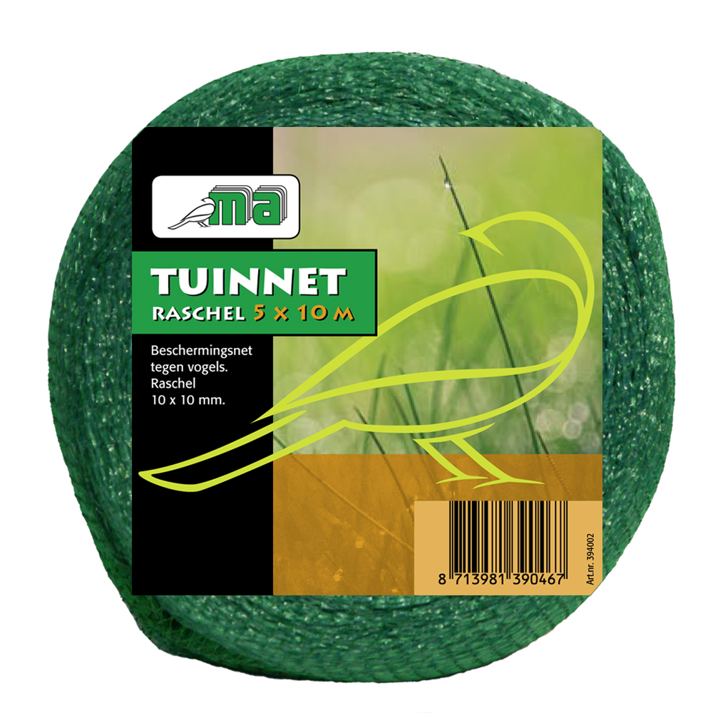 Licht, grofmazig, groen tuinnet om de vijver, fruitboom of net gezaaid gazon te beschermen tegen vogels. Maaswijdte 10 x 10 mm