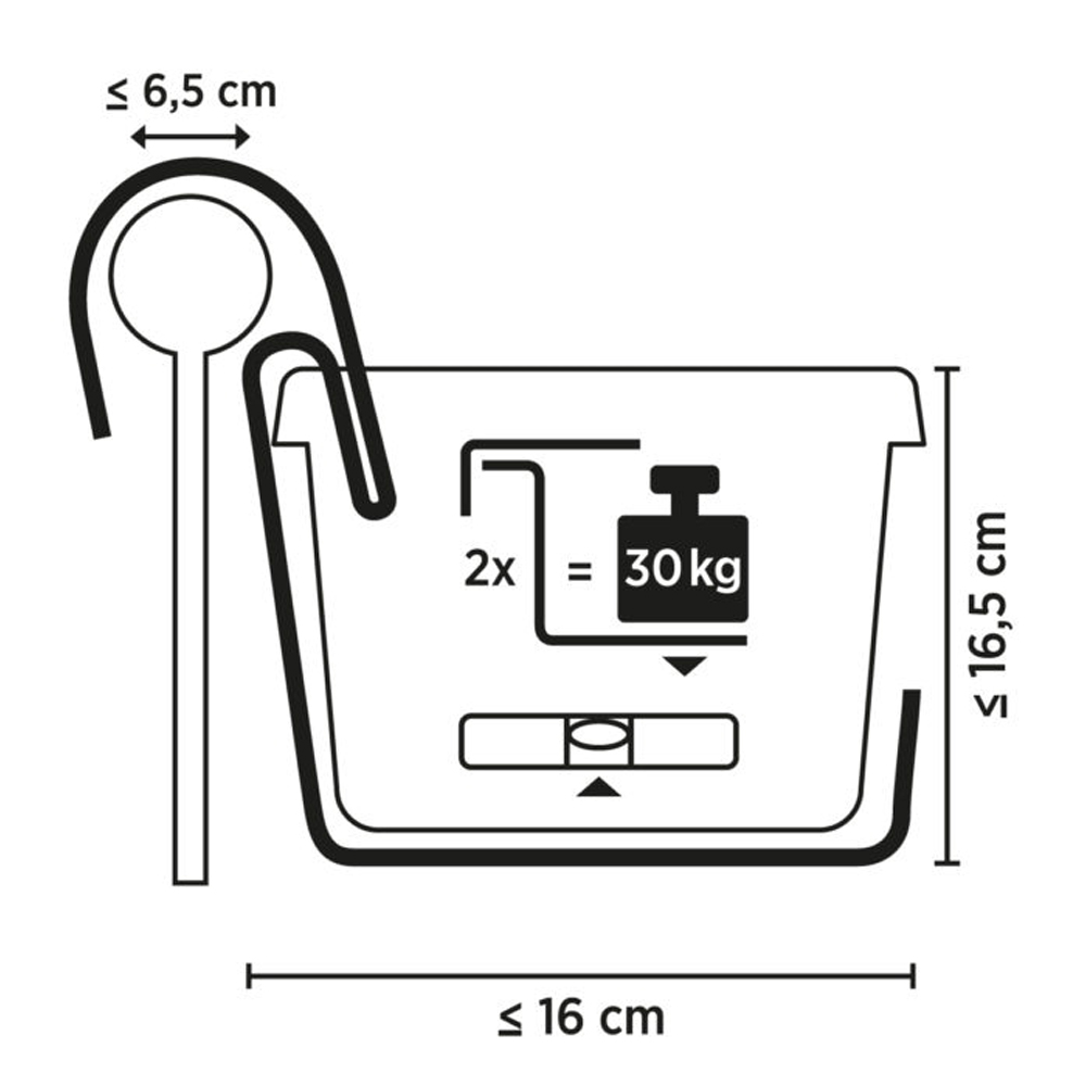 Verzinkte haak voor dunne railing met ronde rand. Maximale bakdiepte 16 cm, maximaler hoogte 16,5 cm. Maximaal 30 kilo in de balkonbak..
